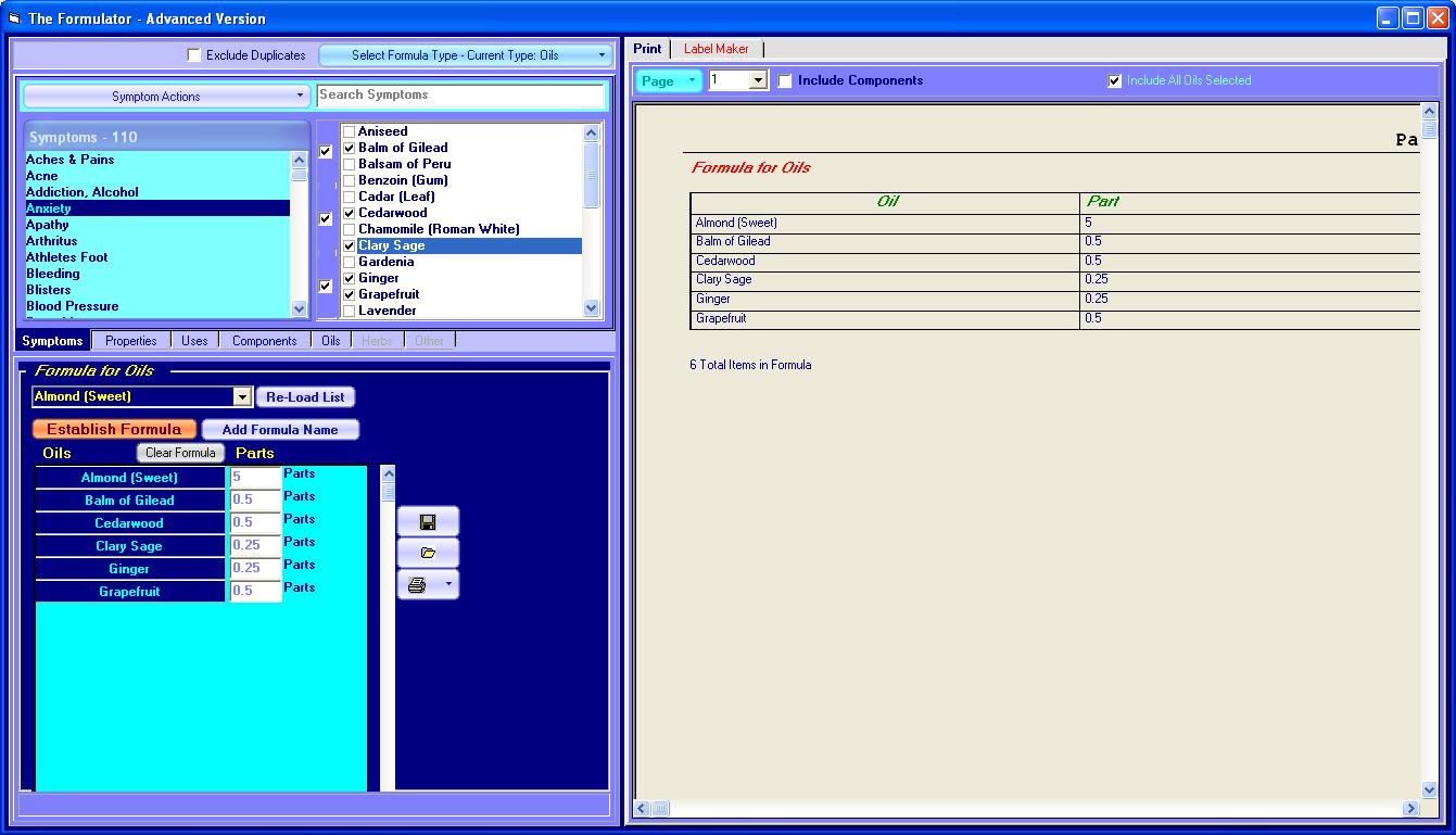 The Following Image shows the start form with a selection of Anxiety, which shows various oils that help with anxiety. A few Oils have been selected and the information for them is displayed in the right hand screen so as to help you decide which oils best serve your purpose.